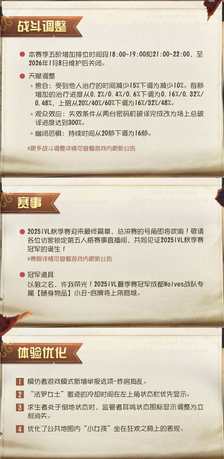 2025年12月25日维护公告:——【2025IVL秋季赛总决赛】:2025IVL秋季赛迎来最终篇章,总决赛的号角即将吹响!敬请各位访客锁定第五人格赛事直播间,共同见证2025IVL秋季赛冠军的诞生! ——【主题活动】:元旦活动 “奇想烟花铺”上线;——【限时玩法】:圣诞限时玩法模式开启,可在匹配入口界面右下角勾选开关,将普通匹配模式切换成圣诞限时玩法模式进入体验。——【商城】:【奇珍时装