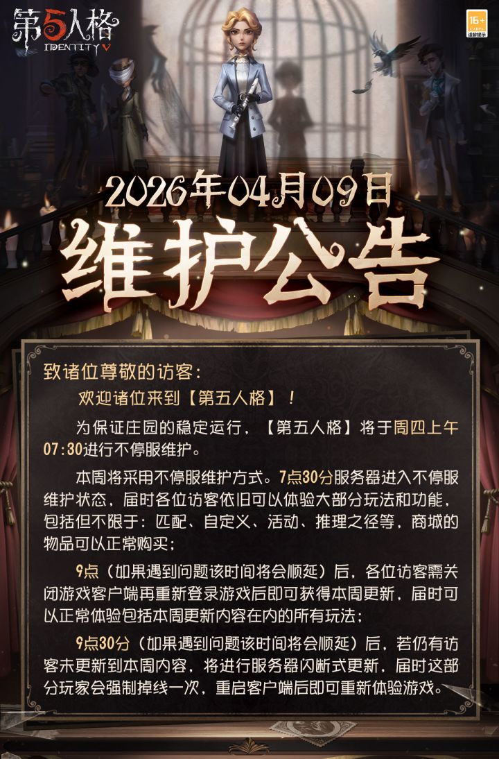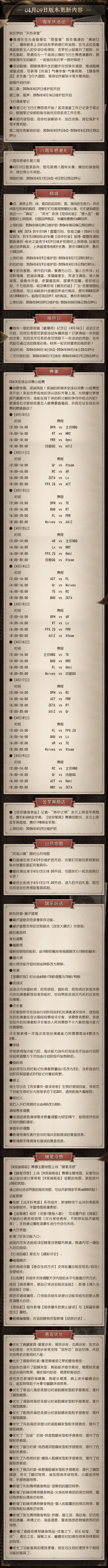 2026年4月9日维护公告:——【剧情活动】:利贝罗的“天外来客”第二章剧情活动开启;——【八周年感谢礼】:4月12日登录游戏,即可领取生日感谢礼:八周年头像、稀世时装体验卡、排位保分卡;——【商城】:【奇珍时装】“愚人金”-解离、【稀世时装】厂长-合家宴、COAVIII冠军ZETA DIVISION战队的专属【奇珍时装】前锋-雷霆竞速和歌剧演员-电光之音限时上架商城;更多详情,请看长图了