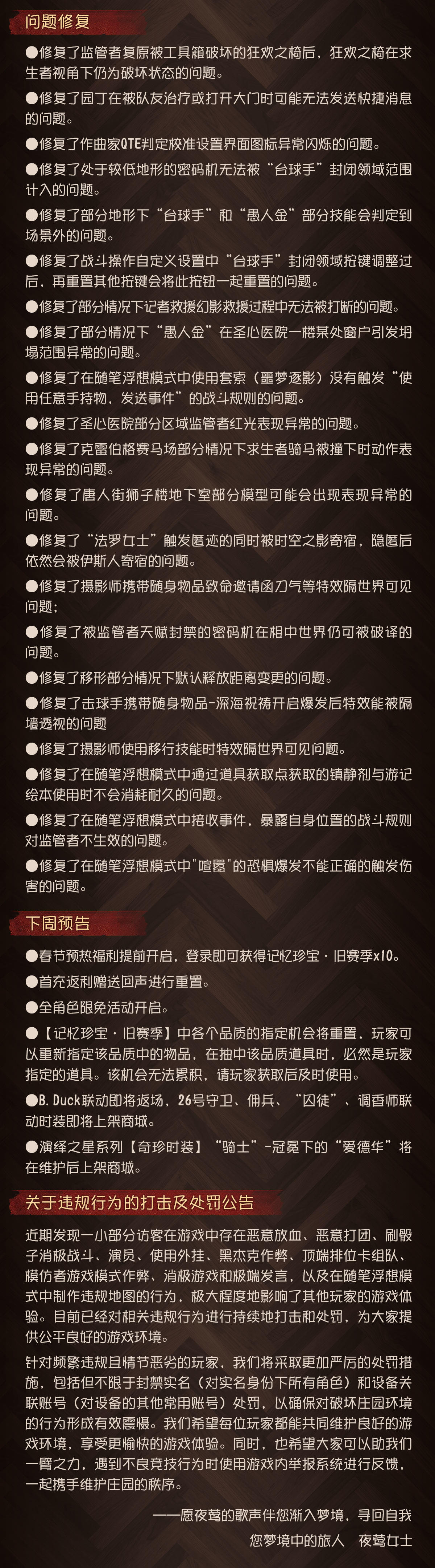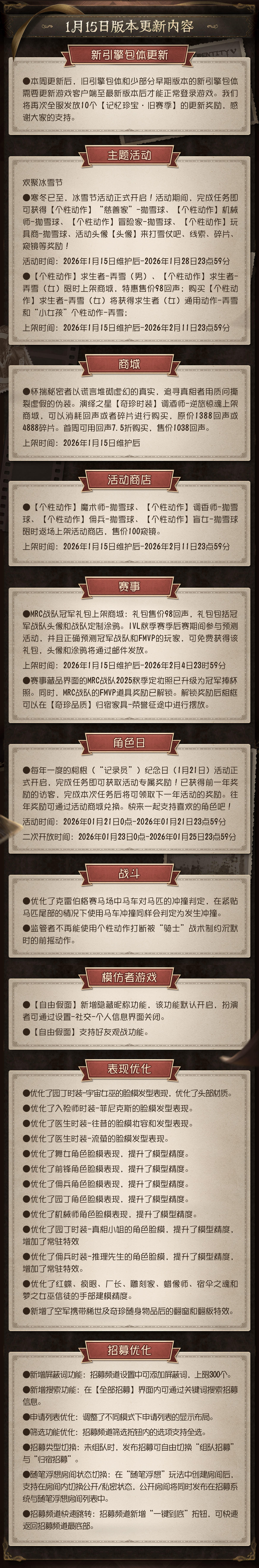 2026年1月15日维护公告:—— 【新引擎】:本周更新后,旧引擎包体和少部分早期版本的新引擎包体需要更新游戏客户端至最新版本后才能正常登录游戏。我们将再次全服发放10个【记忆珍宝·旧赛季】的更新奖励,感谢大家的支持; ——【主题活动】:冰雪节活动正式开启; ——【商城】:演绎之星【奇珍时装】调酒师-逆旅惊魂 上架商城。——【活动商店】:【个性动作】魔术师/调香师/佣兵/盲女-抛雪球限时返