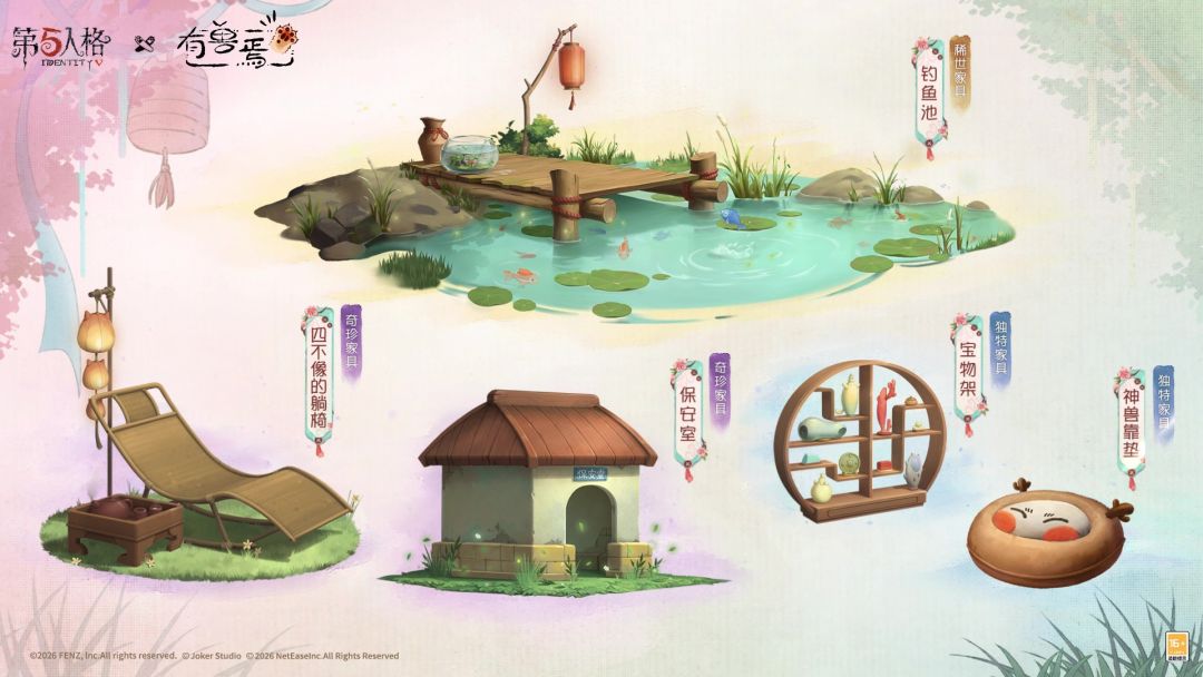 第五人格×有兽焉 联动 【稀世家具】钓鱼池,【奇珍家具】保安室,【奇珍家具】四不像的躺椅,【独特家具】宝物架,【独特家具】神兽靠垫; 游戏内效果展示视频来了,请访客们查收~ #第五人格 #第五人格有兽焉 #第五人格IP联动 #有兽焉 #第五人格五骥映春
