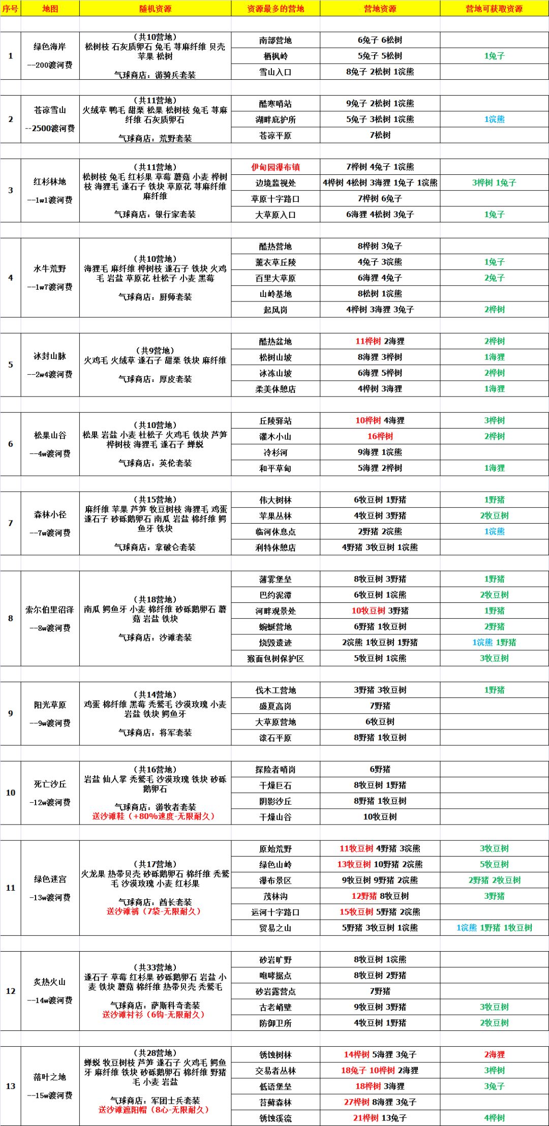 这表格是选取各地图中,资源性价比最高的营地,方便大家用最短的时间,得到最多的资源,包括了不用跑图就能在营地中获取的资源 这里可能就有许多小伙伴提问了 不是全图吗?怎么到了落叶就不更新了? 其实真真正正玩到后面,你就会发现,这游戏的后期就和工厂流水线是一样的,不断重复重复再重复,无非是营地变多了,路变长了,风景不一样了,渡河费变高了。 所以当玩到落叶时,每个玩家就会集齐一套免费的无限耐久套,这个游戏