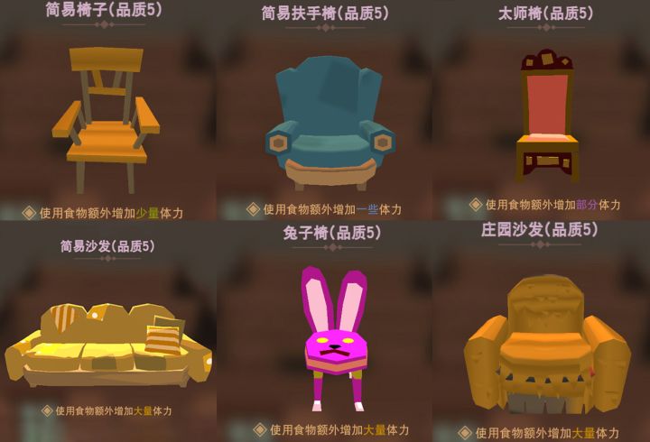 增加食物恢复体力的效果、增加晕倒时体力恢复的速度......更多家具的实用效果尽在这里!