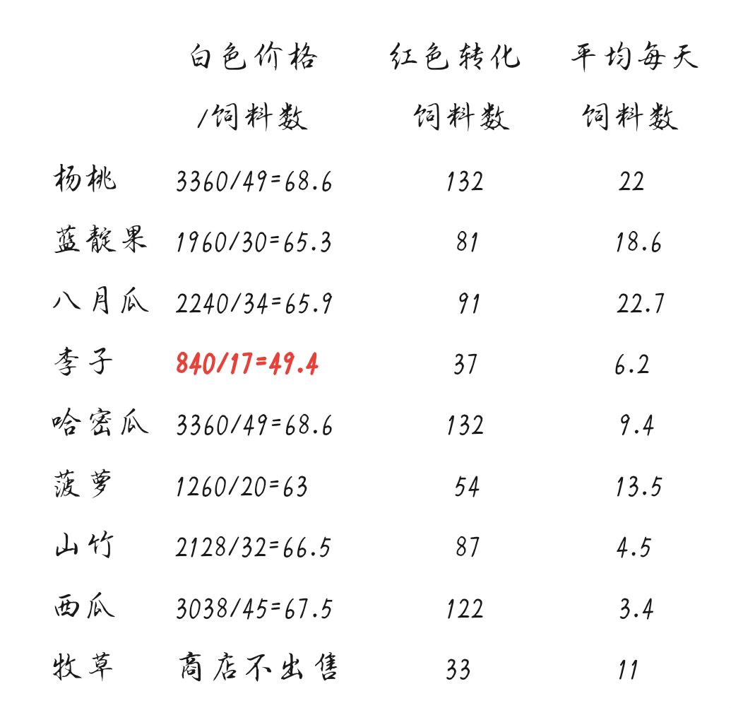 同品种红色水果的价值是白色水果5倍,但转化的饲料数缺最多只有三倍多一点,因此如果从商店买水果来喂食的话,应该购买白色水果,其中白色李子是价格最合适的,每饲料仅需49.4块(以下按50块计算)。 在全年不换种不断魔药的情况下,收益最高的是玉米。玉米在春夏秋三季都是两天一收,分解为玉米种子可卖1822*3=5466,平均在全年相当于每天每棵玉米收入2050元(未计入冬季收入)。 种玉米再买白色李子每天