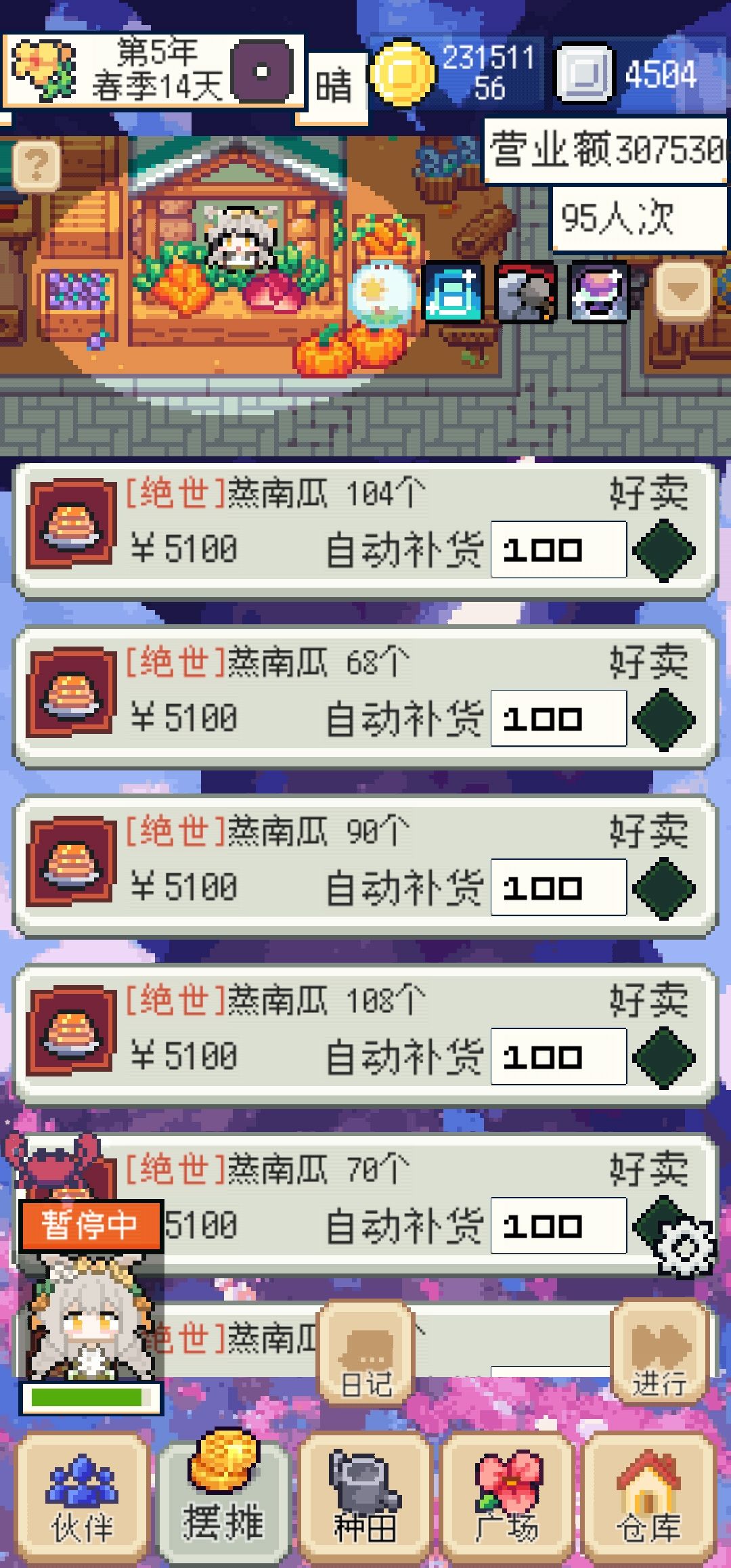 首先这个办法只适合中后期用 详细来说就是在第二年购买到南瓜种子后,培育到紫色完美品级后上架出售,这样在商店那边就可以直接购买,同时需要在每个季度的第15天,也就是集市上购买犀牛动物蛋,孵化完之后生产红色调味油后继续上架出售,和南瓜一样,就都可以解锁购买,最后一个需求需要在集市上购买食谱开到“蒸南瓜"这个食谱,这个食谱的稀有度不高,开起来还是很容易的,在集市上还需要购买两样东西,分别是防腐剂和金箔,