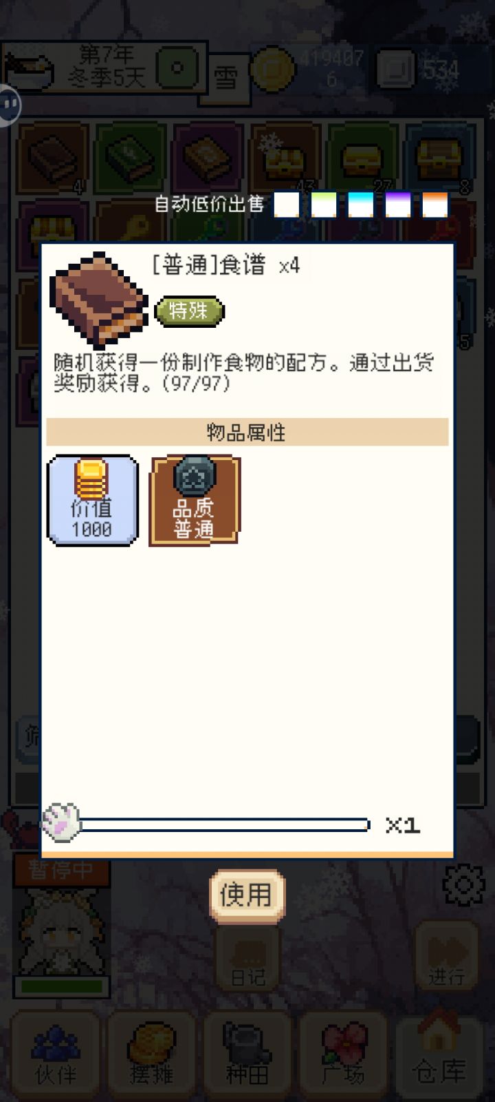 目前玩了两个档,现在玩到第四年,第一个档因为技能全部看视频开,导致包里老是出现低级种子选择重开。(包里蓝色的是第四年新出的种子还没升完品质)首先愿意看视频的话看视频开局,不愿意的话随意开局,进度慢一点罢了。开局后直接点开背包开箱子,出价格几千的武器或者魔药后再开局(同样只是省时间,sl不需要卸载重装,直接关掉再开就行,每天自动保存)。决定开局后先去设置把加速时间看到个360天480天😎。然后正式