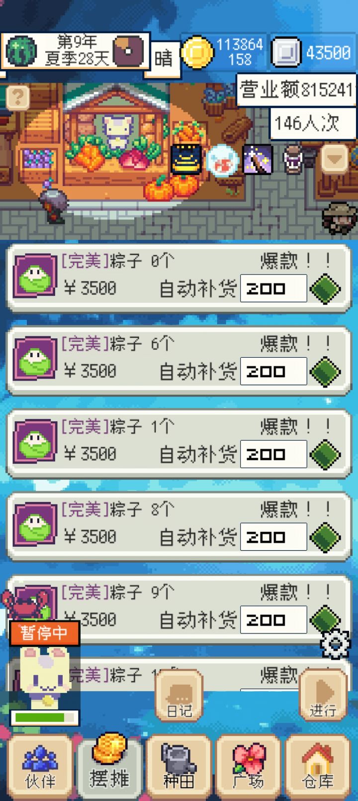首先请出我们的主角:粽子!食物甜品,夏天热销,出货的速度极快,平均每个摊位一天可以卖100+具体操作:前提条件:夏天,完成城镇的建设 学习料理产出加一、料理售价提高,满好感度桃桃巫,甜品价格药剂购入白色品质水稻(价格2100),红色品质水(价格42),红色品质甜菜(价格9800)白色品质水稻+红色品质水~四个蓝色品质米饭(单个米饭成本535.5)三个红色品质甜菜~四十三个红色品质糖(单个