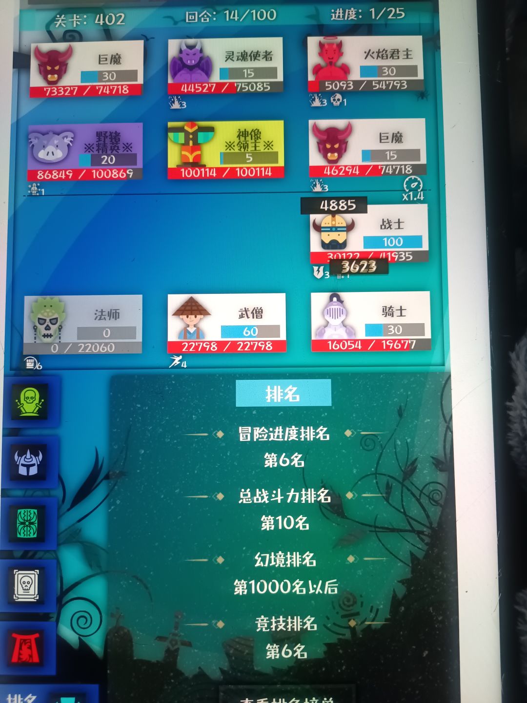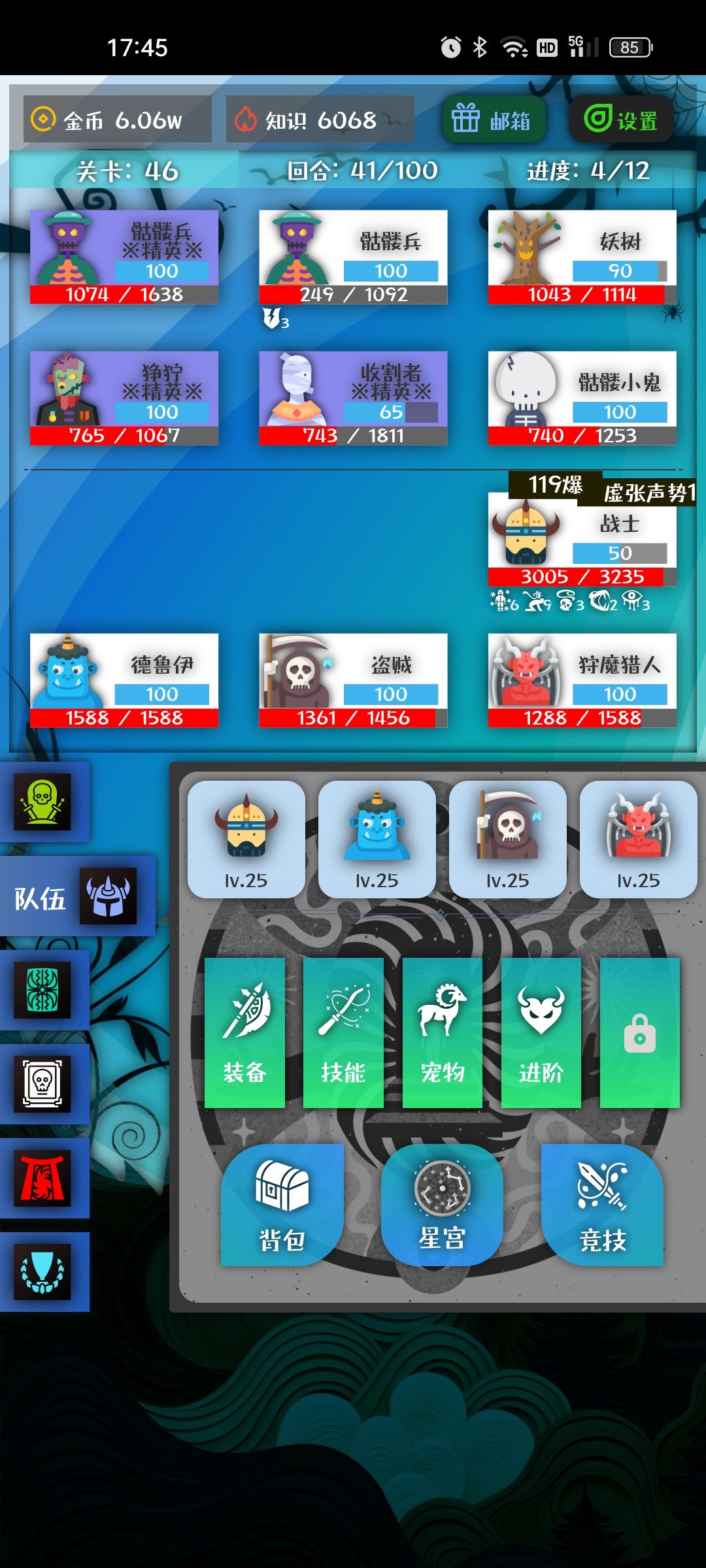 1.这游戏是挂机游戏,只有策略和运气没有操作,玩法是选四个角色在100回合内打死25只怪。所以核心就是在保证更多角色活着的情况下提高输出。 2.充钱资源就多。想冲排行榜前十至少要月卡,零氪也能玩。开局买月卡和勇士性价比最高,氪佬买灵丹提升最大。 3.开局英雄。单德鲁伊加一级骑士。前期资源宝石有限只能保证一个角色活着并且有输出德鲁伊是最好选择。有蓝宝石首先德鲁伊生命恢复,不要合成3级先2级装满。什么