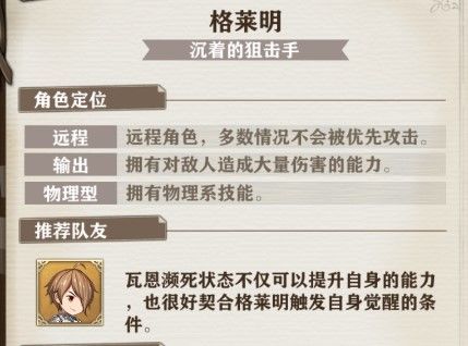在苍之纪元的背景设定里有一个从小父母双亡身世惨重的人物,那就是我们的格莱明!由于环境所致,在孤儿院长大的他天生显得比较娇小,甚至老被人当做女孩子。然而与外表不同,格莱明远比其他孩子坚强和冷静,在经过了不懈的努力之后,最终成为了一名强大的狙击手。作为一个后排稳定输出的ADC,我们就来详细了解一下格莱明的技能吧!首先我们来看看格莱明的定位和队友推荐:瓦恩濒死的被动效果和格莱明的被动效果真的是形成完