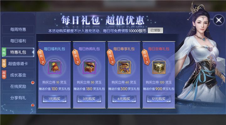 游戏中的福利玩法是一个汇聚了众多超值福利的地方,特惠礼包就是其中非常具有性价比的一个。我们可以在特惠礼包中每天选择四个礼包购买,今天我们一起来了解一下特惠礼包都有哪些值得大家购买的。 【每日礼包】 在每日礼包超值优惠中,道友们每天可以购买四种不同档次的每日福利礼包,分为每日福利礼包、每日热购礼包、每日尊享礼包和每日至尊礼包。每日福利礼包售价1元,购买后可以获得10灵玉以及每日福利礼包,可以获得10