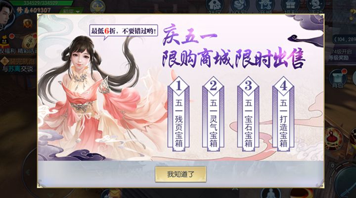 简介:五一限时商城介绍在择天记这一款游戏中,每一次的节日,都少不了各种各样的福利礼包与活动。每一次的礼包与活动都值得玩家去期待。为了迎接即将到来的五一节,游戏中特地为玩家准备了很多福利活动,在昨天的更新中,限时商城已经开启,让玩家提前享受五一的乐趣。那么在欢庆五一的限时商城中都有哪些内容呢,让我们一起来看看吧。限时商城活动为了欢庆五一,游戏中为玩家准备的限时商城已经开启,玩家可以在限时商城中