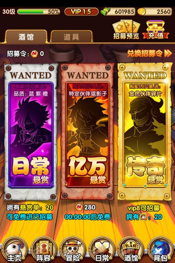 想要成为这片海域上的霸主吗?想要活动强大的伙伴吗?请来传奇招募——招募你的最强助力吧!!! *图片数据以游戏实际显示为准 传奇招募活动需VIP4等级且达到76级的船长才可进行招募,招募需要消耗招募令或传奇悬赏单,但每次招募都会获得原生金卡伙伴碎片和传奇积分。 船长们可用传奇积分在传奇商店兑换原生金卡伙伴专属培养材料,需要注意的是每周使用招募令或传奇悬赏单进行招募时,招募次数上限各有不同。 *图片数