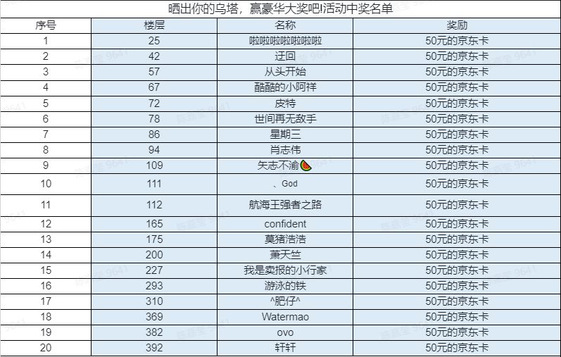 恭喜以下船长在本次“晒出你的乌塔,赢豪华大奖”活动中中奖 【发放时间】 请获奖的船长在3个工作日内添加官方QQ“1290347463”留言相关信息 我们将在公布名单后的7个工作日内发放奖励 【留言格式】 中奖京东卡以及手办的玩家需要提供收货地址、真实姓名以及电话; 中奖游戏礼包的玩家需要提供taptap个人中心截图以及回复的楼层数; 我们会核实名单并发放奖励。如超过兑奖时间,则视为自动放弃。 【5