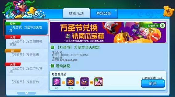 万圣节活动 今日正式开启啦 以下活动 仅限一天 仅限一天 仅限一天 巴巴琪万圣皮肤免费兑换 活动时间:2018年10月31日00:00—23:59(仅限一天) 怪味糖果*5+南瓜*5+女巫帽*5=不给糖就捣蛋碎片*5 万圣节头像框 单笔充值300宝石送万圣节头像框和铁南瓜宝箱,泥萌还记得铁南瓜宝箱可能开出什么吗?是的,玩笑魔王、圆头绅士、还有脚印等等哦~ 金币售卖 巴巴琪英雄、铁南瓜宝箱万圣节当天
