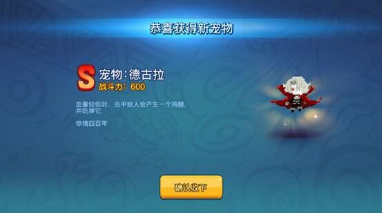 存活了400年的德古拉在一个漆黑的月圆之夜已经降临到了野蛮人的大草原上,为了寻找之际深爱着的那个她.......... 但是在草原上,德古拉伯爵发现这里的小动物都太可爱了,而这些野蛮人看上去也是臭臭的,所以最后他选择了另外一种获得能量的方式——从对方的身上获得鸡腿 以上纯属胡诌,如有雷同,纯属巧合,噗噗 宠物介绍 德古拉:惊情四百年 宠物属性 血量较低时,击中敌人会产生一个鸡腿,并吃掉他 宠物类型
