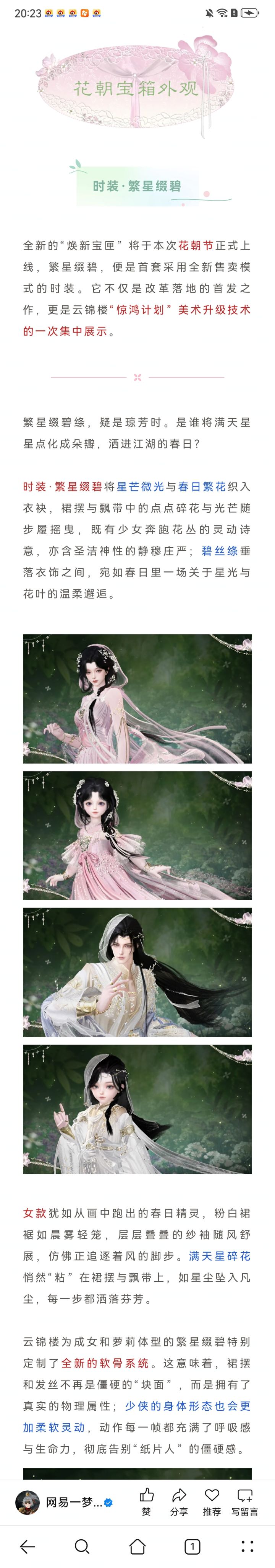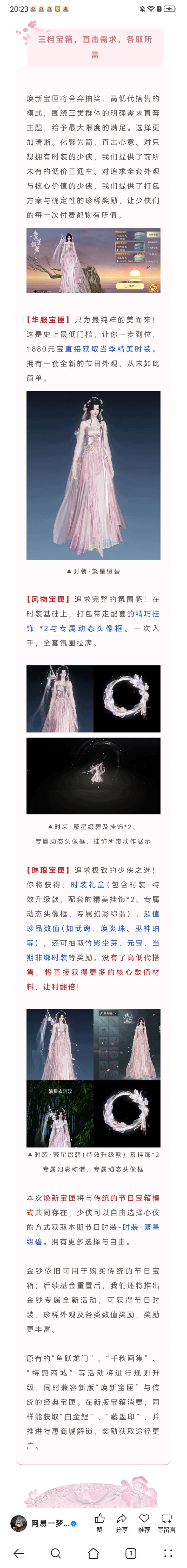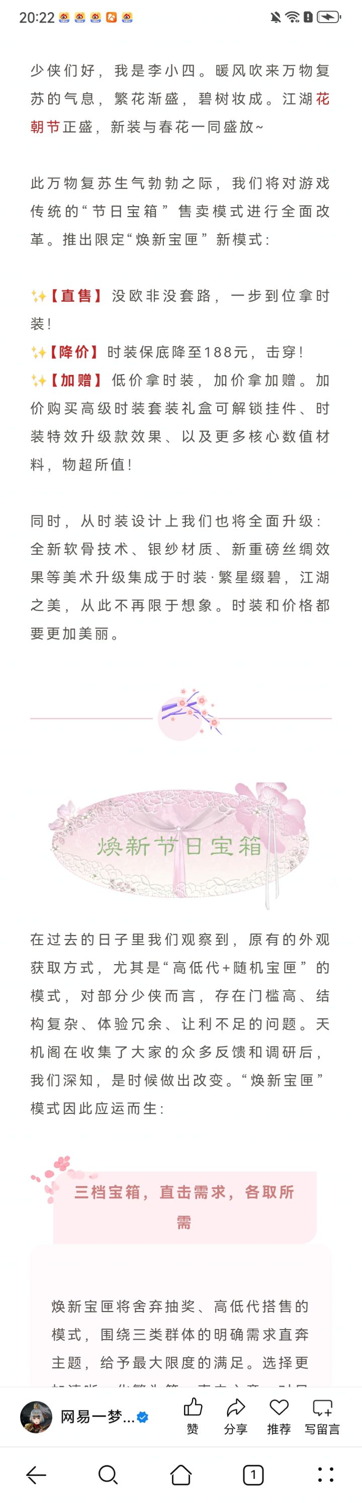 少侠们好,暖风吹来万物复苏的气息,繁花渐盛,碧树妆成。江湖花朝节正盛,新装与春花一同盛放~ 此万物复苏生气勃勃之际,我们将对游戏传统的“节日宝箱”售卖模式进行全面改革。推出限定“焕新宝匣”新模式:✨【直售】没欧非没套路,一步到位拿时装! ✨【降价】时装保底降至188元,击穿!✨【加赠】低价拿时装,加价拿加赠。加价购买高级时装套装礼盒可解锁挂件、时装特效升级款效果、以及更多核心数值材料,物超