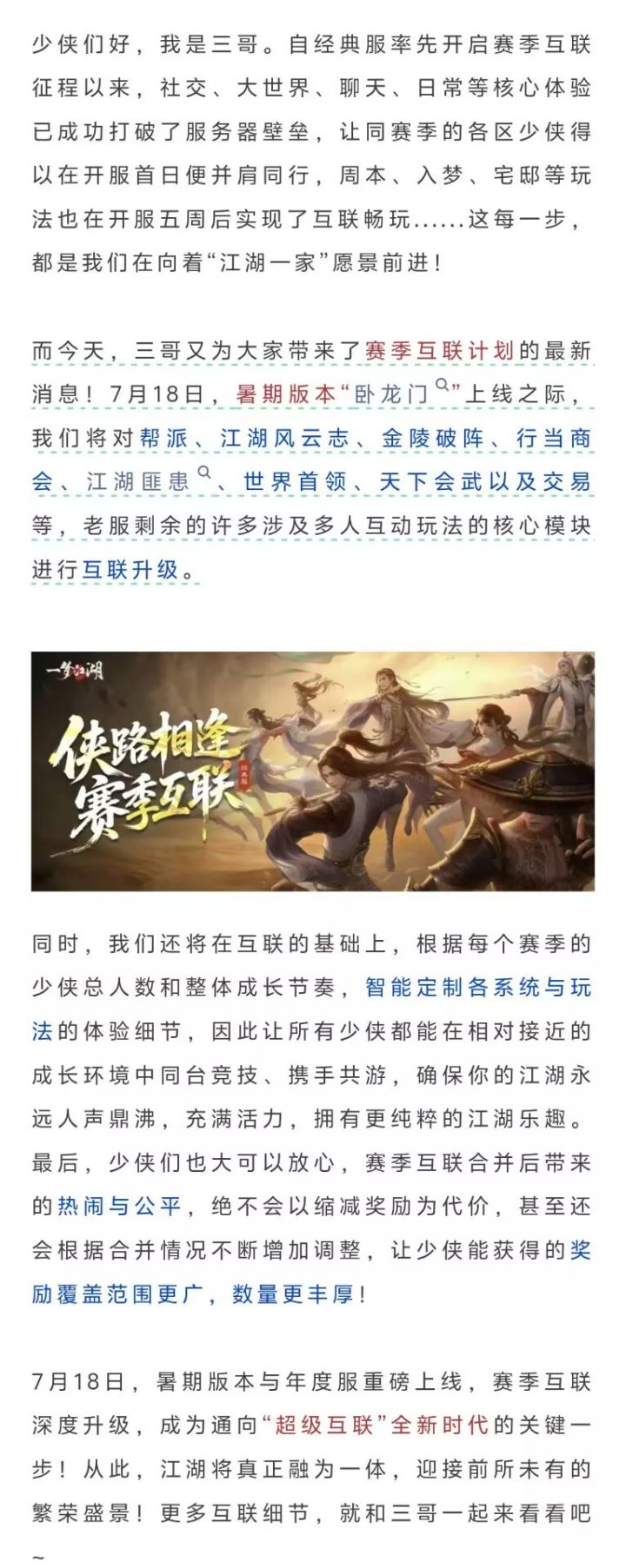 大家好,我是天机阁弟子小寒。又是一年盛夏将至,暑期版本“卧龙门”也即将与大家见面,新门派龙门、盛满烟火气与美景的蜀中也即将在少侠们的期待中上线,而暑期版本同名重点服的预约也即将开启。往往每年的这个时候,都会有海量的少侠回归江湖,来看看这一年江湖焕新的精彩内容;当然江湖也会迎来许多怀揣着各色武侠梦的新朋友,去新服共同开启新一轮的江湖冒险。我一直在思考一个问题:“一个什么样的重点服更加适合这些踏入