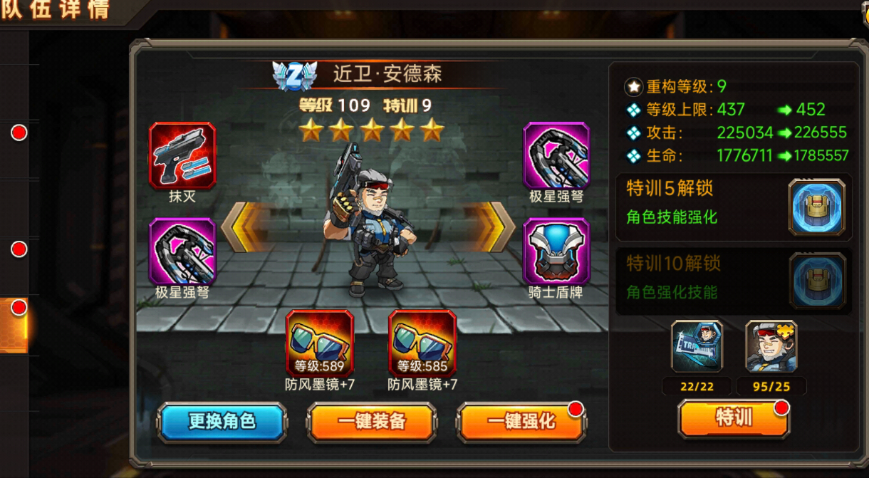 现在一共玩了8天,每天都有上线,试炼之地和登峰戈壁全通,绿洲竞技场差2层通关,北天馆还没找到在哪里解锁(这个有大佬知道吗),芯片搞了一个没啥用。剧情还是卡在困难外传5,没想到这个破秘境还要150级才能打,天谴主炮解限5(暂时不太清楚解限的作用),氪金的原因就是花钱买开心呗┭┮﹏┭┮,就是这游戏唯一的缺点没啥攻略可以参考