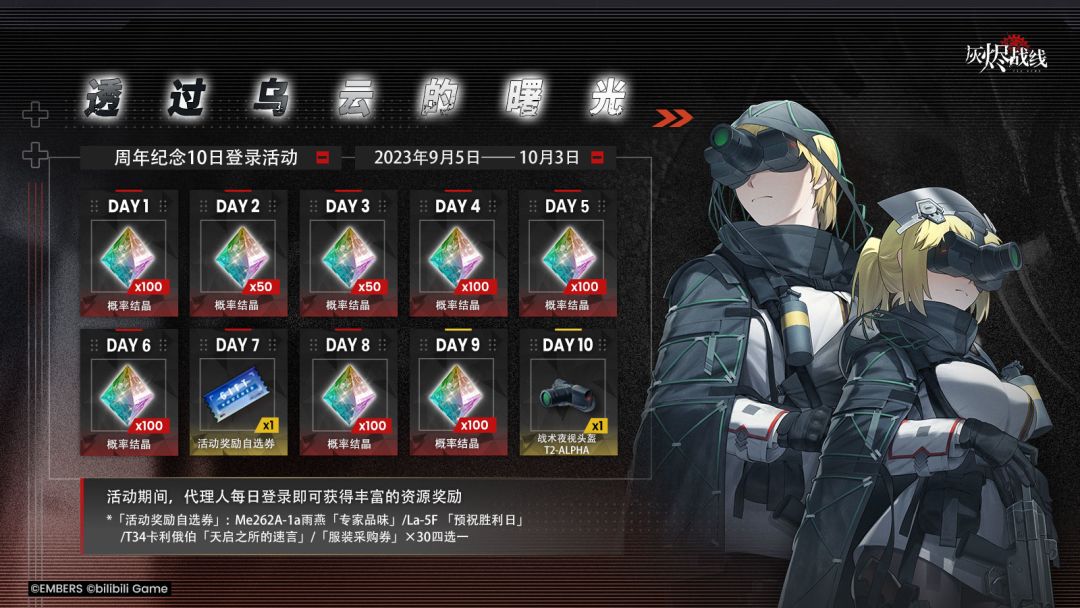 尊敬的代理人: 2023年9月5日——10月3日期间 灰烬战线三周年纪念10日登陆活动「透过乌云的曙光」将会限时开启! 累计登录10日可得「概率结晶」、「活动奖励自选券」以及新增代理人外观「荒野猎行者」 —— 今后也请大家继续支持《灰烬战线》