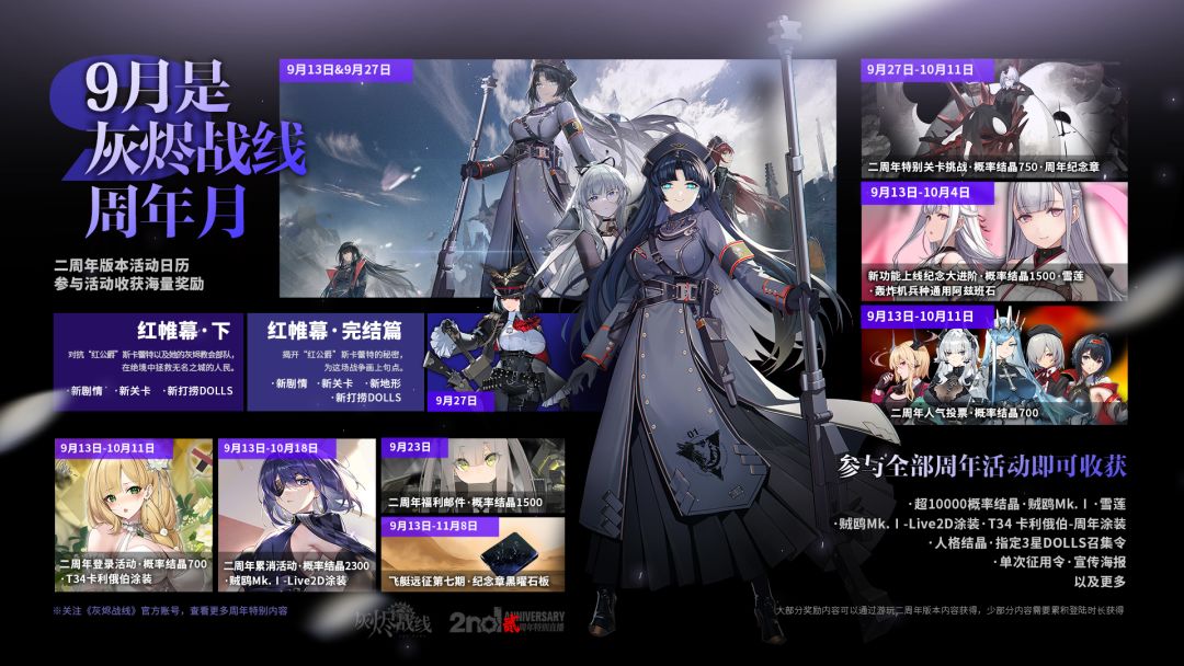 亲爱的代理人: 为了庆祝灰烬战线二周年 也为了让大家更直观的了解周年版本的特色活动和福利内容。 我们制作了一份二周年版本活动日历,请代理人过目。 祝大家二周年快乐!
