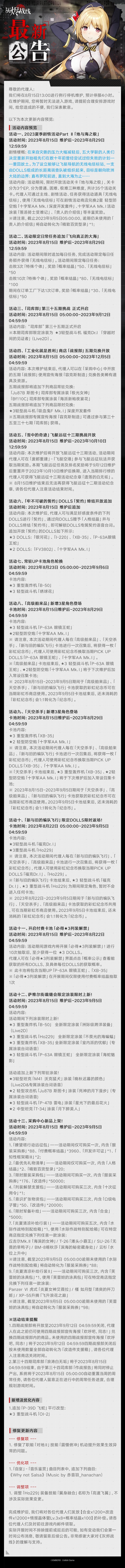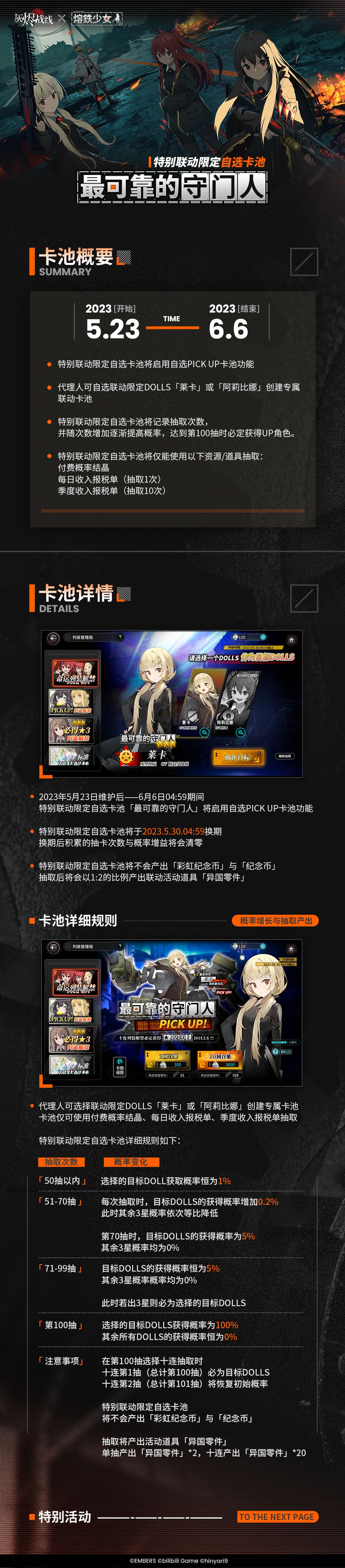 尊敬的代理人: 2023年5月23日维护后—2023年6月6日04:59期间 特别联动限定自选卡池「最可靠的守门人」将限时开启! 本次将启用自选PICK UP卡池功能——命运列装解禁 代理人可自选联动限定DOLLS「莱卡」或「阿莉比娜」创建专属联动卡池 此外,代理人可通过参与各项活动和购入联动特别礼包 获赠联动专属抽卡道具「每日收入报税单」和「季度收入报税单」 其中免费获得的抽卡道具累计可在联动限
