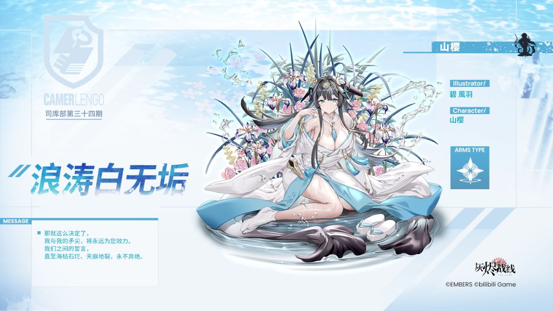 那就这么决定了,我与我的矛尖,将永远为您效力。 我们之间的誓言,直至海枯石烂、天崩地裂,永不弃绝。 —— ★3 重型轰炸机「山樱」全新司库部涂装「浪涛白无垢」将于7月18日上线, 各位代理人可以在司库部解锁「神秘请柬」或「亲笔推荐信」后, 提升战报统计等级获取涂装奖励!