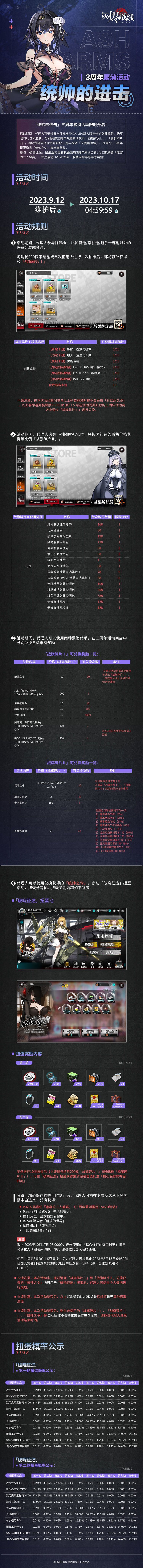 尊敬的代理人: 2023年9月12日维护后——2023年10月17日 3周年纪念累消活动「统帅的进击」将会限时上线! 参与三周年累消活动克获得三周年专属累消代币「战旗碎片Ⅰ」、「战旗碎片Ⅱ」,消耗专属累消代币兑换三周年福袋「天翼旋律盒」、征用令、3周年扭蛋道具「统帅之令」等丰富奖励。 参与「破晓征途」扭蛋活动更有机会获得3周年累消全新LIVE2D涂装「雍容的二人盛宴」、往届累消LIVE2D涂装、服
