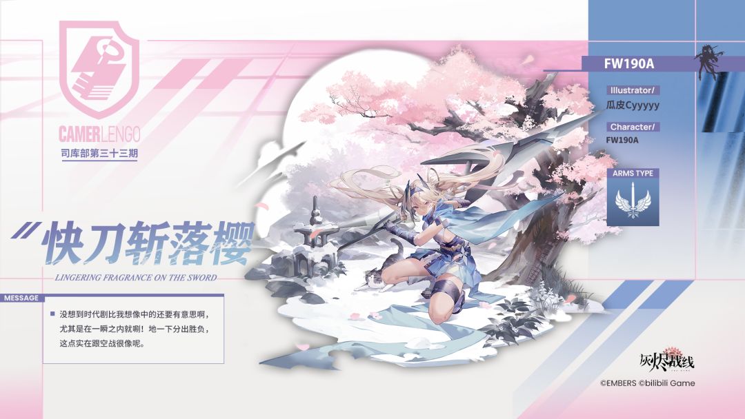没想到时代剧比我想像中的还要有意思啊,尤其是在一瞬之内就唰! 地一下分出胜负,这点实在跟空战很像呢。 —— ★3 轻型战斗机「FW190A」全新司库部涂装「快刀斩落樱」将于6月20日上线, 各位代理人可以在司库部解锁「神秘请柬」或「亲笔推荐信」后, 提升战报统计等级获取涂装奖励!