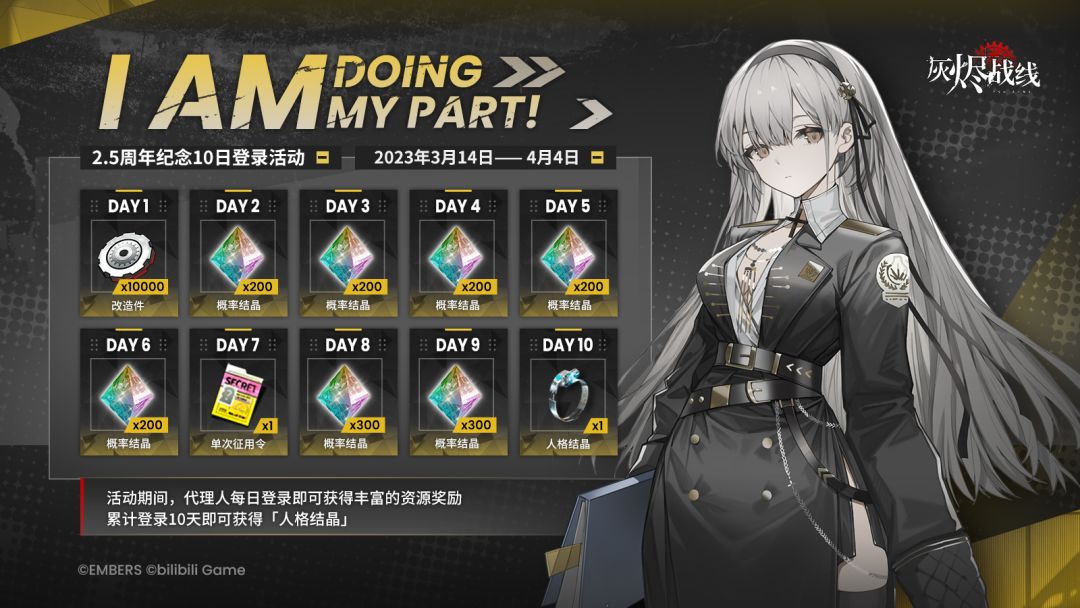 尊敬的代理人: 2023年3月14日——4月4日期间 2.5周年纪念10日登录活动「I am doing my part!」将会限时开启! 活动期间,代理人每日登录即可获得丰富的资源奖励 累计登录10天即可获得「人格结晶」