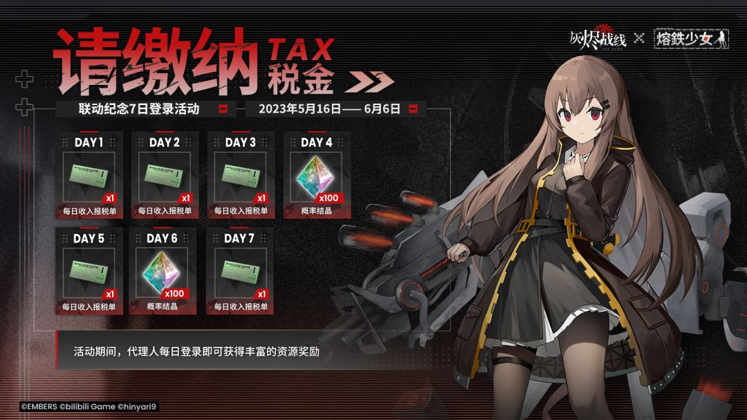 尊敬的代理人: 2023年5月16日——6月6日期间 特别联动纪念7日登陆活动「请缴纳税金」将会限时开启! 活动期间,代理人每日登录即可获得丰富的资源奖励 —— 《灰烬战线》×《熔铁少女》 全新特别联动活动——铁屑余烬 即将于5月23日开启 更多情报持续公开中,敬请期待!