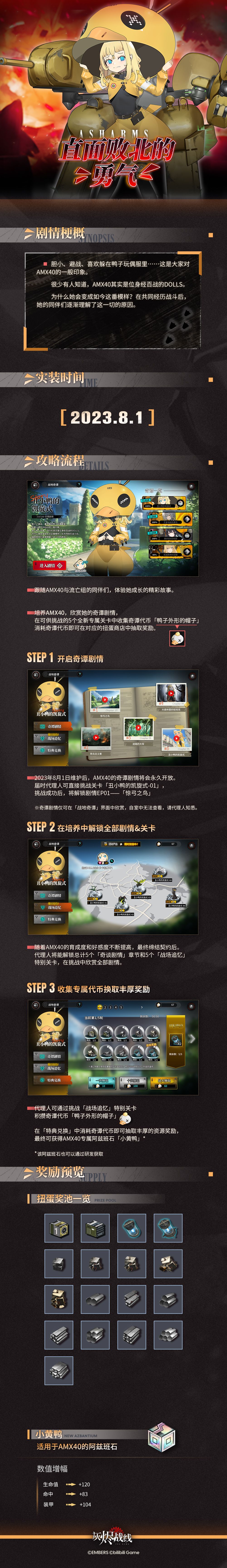 胆小、避战、喜欢躲在鸭子玩偶服里……这是大家对AMX40的一般印象。 很少有人知道,AMX40其实是位身经百战的DOLLS。 为什么她会变成如今这番模样? 在共同经历战斗后,她的同伴们逐渐理解了这一切的原因。 —— 战地奇谭全新剧情篇章——丑小鸭的凯旋式 即将于8月1日实装,敬请期待!