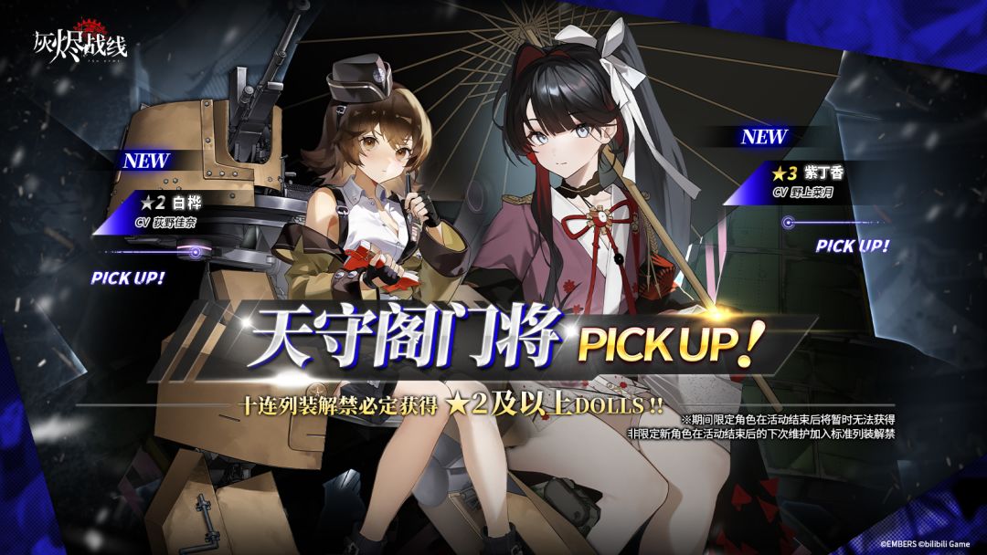 尊敬的代理人: 2023年6月20日——2023年7月4日04:59期间 全新角色卡池「天守阁门将」将限时开启! 届时以下DOLLS将限时加入卡池并提升获得概率: ★★★ 重型战斗机「紫丁香」 ★★ 轻型防空炮「白桦」 —— 活动期间,每进行1次列装解禁即可获得1枚「彩虹纪念币」 代理人可消耗彩虹纪念币换取当期PICK UP DOLLS ※「天守阁门将」卡池结束后,「紫丁香」、「白桦」会在下次维护
