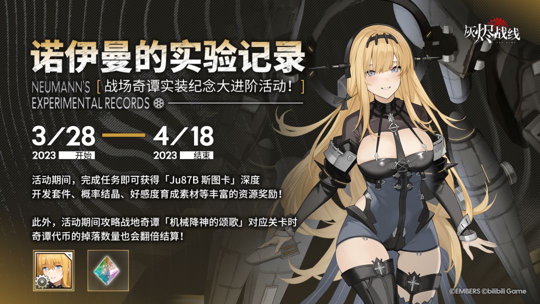 尊敬的代理人: 2023年3月28日——2023年4月18日期间 战地奇谭更新纪念大进阶活动「诺伊曼的实验记录」将会限时开放! 完成任务即可获得「Ju87B 斯图卡」深度开发套件、 概率结晶、好感度育成素材等丰富的资源奖励! 此外,活动期间攻略战地奇谭「机械降神的颂歌」对应关卡时, 奇谭代币的掉落数量也会翻倍结算! ※活动为掉落数量双倍(非掉落概率双倍)