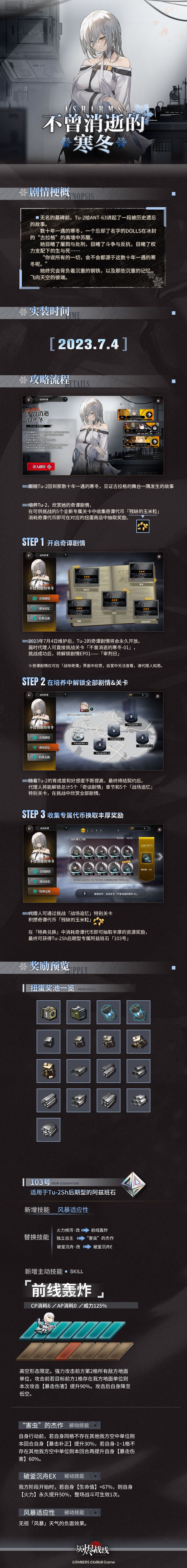 无名的墓碑前,Tu-2给ANT-63讲起了一段被历史遗忘的故事。 数十年一遇的寒冬,一个忘却了名字的DOLLS在冰封的“古拉格”的高墙中苏醒。 她目睹了屠戮与处刑,目睹了斗争与反抗,目睹了权力支配下的生与死…… “你说所有的一切,会不会都源于这数十年一遇的寒冬呢。” 她终究会背负着沉重的钢铁,以及那些沉重的记忆,飞向天空的彼端。 —— 战地奇谭全新剧情篇章——不曾消逝的寒冬 即将于7月4日实装,敬