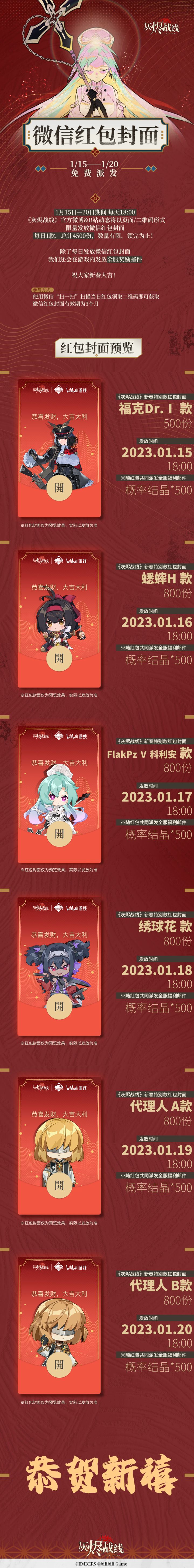 ※以下为转发:大家好,这里是余烬组非常荣幸能和大家度过意义非凡的一年为表感谢,在这辞旧迎新之际我们制作了6款《灰烬战线》新春特别款红包封面将在1月15日——1月20日期间每天18:00限量派发在派发微信红包封面的同时,游戏内也会发放全服奖励邮件祝大家身体健康,顺心如意新的一年里,也请继续支持《灰烬战线》