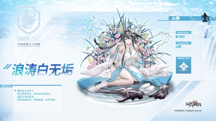 那就这么决定了,我与我的矛尖,将永远为您效力。我们之间的誓言,直至海枯石烂、天崩地裂,永不弃绝。——★3 重型轰炸机「山樱」全新司库部涂装「浪涛白无垢」将于7月18日上线,各位代理人可以在司库部解锁「神秘请柬」或「亲笔推荐信」后,提升战报统计等级获取涂装奖励!