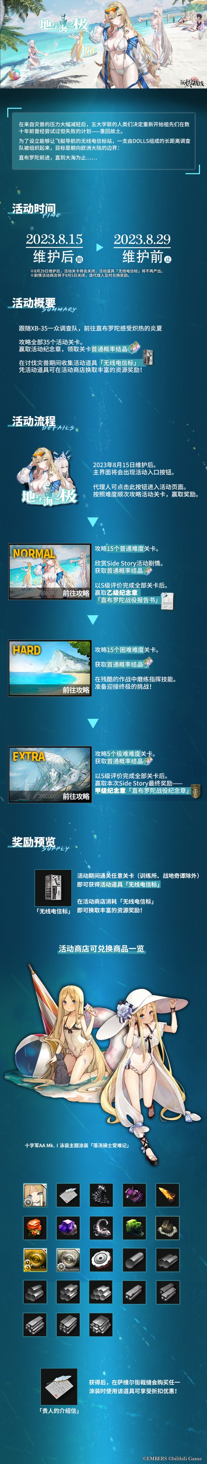 尊敬的代理人:2023年8月15日维护后——2023年8月29日期间,全新Side Story剧情活动「地与海之极」将会限时开启!活动期间,大家将跟随XB-35一众调查队,前往直布罗陀感受炽热的炎夏。攻略全部35个活动关卡。赢取活动纪念章,领取关卡首通概率结晶在游玩过程中,大家可以不断收集活动道具「无线电信标」凭活动道具可在剧情活动商店换取丰富的资源奖励!更有新★2DOLLS「十字