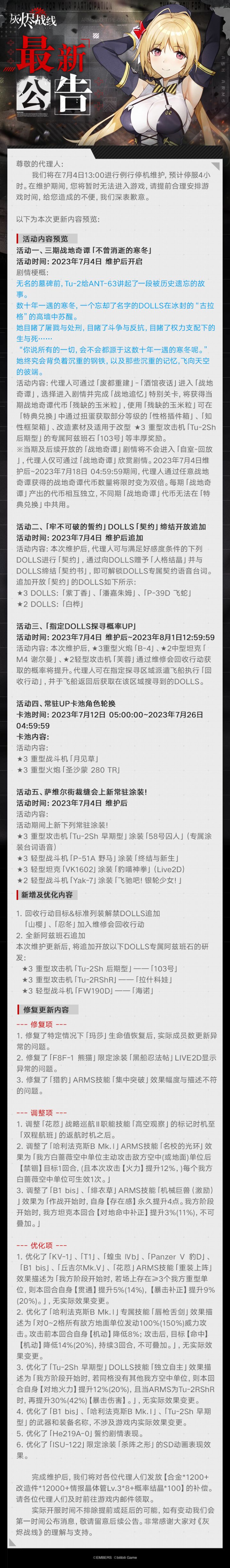 活动时间:7月12日 5:00——7月26日 4:59活动内容:【PICK UP!列装解禁】DOLLS轮换,活动期间★3 DOLLS 重型战斗机「月见草」、★3 DOLLS 重型火炮「圣沙蒙 280 TR」获得概率提升。您可在【列装解禁】-【概率公示】界面查看卡池所含具体角色及对应概率。同时,物资管理局纪念硬币商店将上架指定PICK UP角色,活动期间您可使用纪念硬币兑换「月见草」及「圣沙蒙