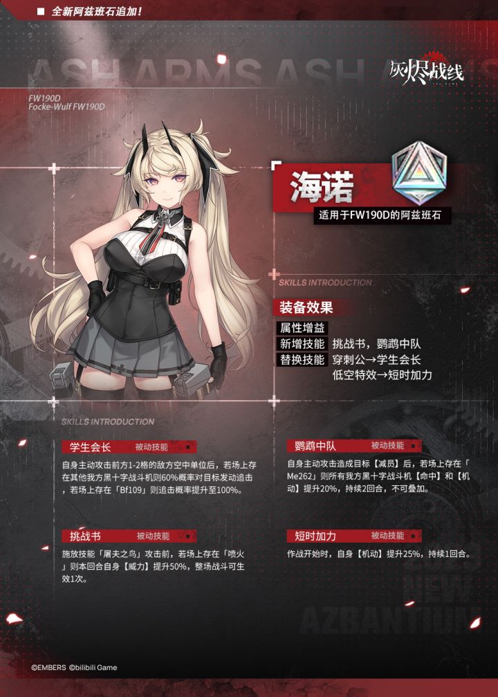 尊敬的代理人:2023年7月4日维护后,以下2名DOLLS的专属阿兹班石将会开放研发。届时大家将能消耗「阿兹班晶核」和「记忆体」研发对应的阿兹班石:★3重型攻击机「Tu-2RShR」——「拉什科娃」★3轻型战斗机「FW190D」——「海诺」——适用于通常改型★3重型攻击机「Tu-2Sh后期型」的专属阿兹班石——「103号」将于本次更新后的战地奇谭中获取——更多详情,请点击图片查看