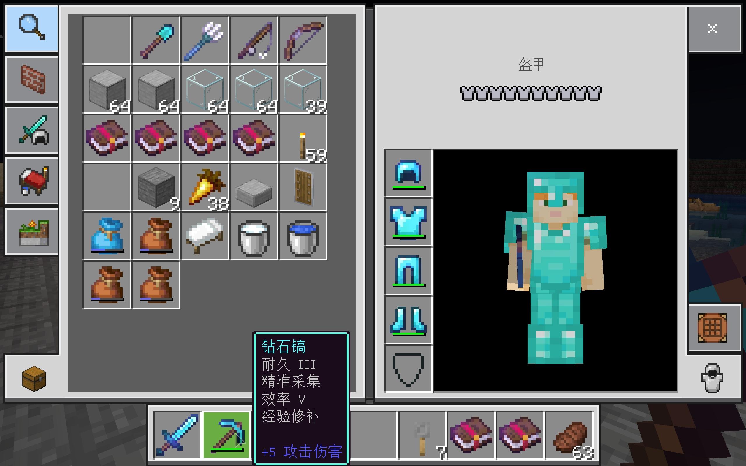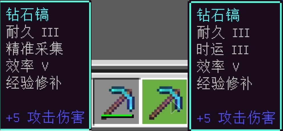 把 示字旁 换成 宝盖头 是为了突出其“宝贵”的属性()其实是岷叔那边的老梗了,哈哈......说说它们的的来历吧。其实是我为了给我联机的朋友弄把稿子用,结果意外附出了 效率Ⅳ、时运Ⅲ,顺带一个 耐久Ⅲ (我原来的两把没怎么凹,都只有效率Ⅲ) 。于是想着来都来了嘛,就把原本的精准采集稿也一并敲上了 效率Ⅴ (海之眷顾Ⅲ魅力时刻,我家里附魔书基本都是钓上来的~) 。就是这样啦。#我的世界#Minecraft
