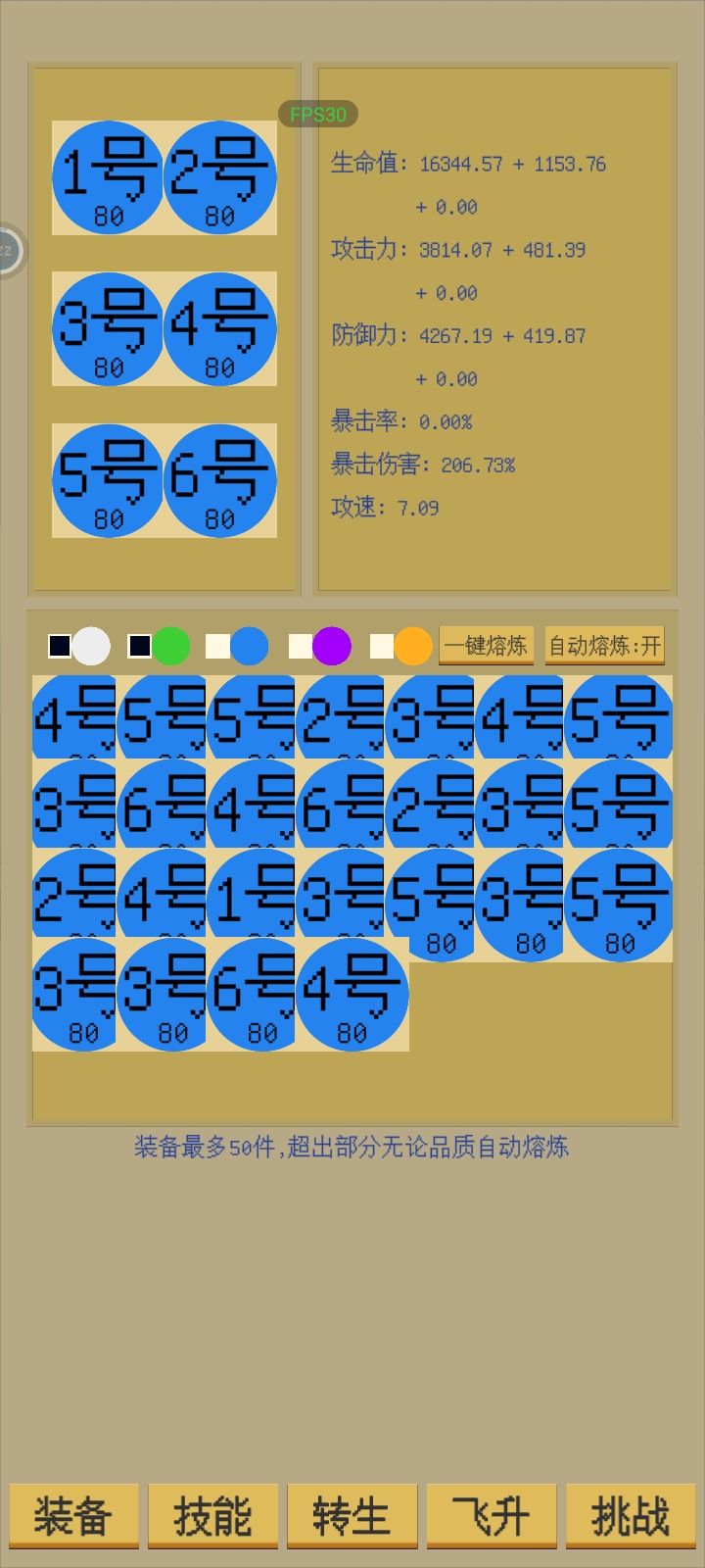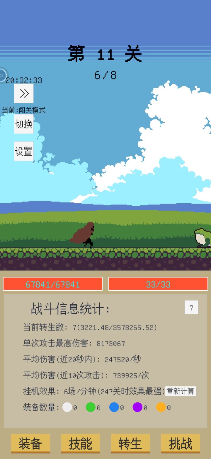 0转时,装备找暴击词条,暴击1000次解锁技能组成--防御力加成+首爆增伤+首伤必爆;然后装备换成找爆伤词条(装备基础数值不重要,熔炼给的三维才是大头),这样打小怪一刀杀,boss打不赢也没事三维提上去会过的。在线挂效率高,想离线的话就打到效果最强关再退。几个小时后就达到转生条件了(立刻转生溢出没好处)转生后升装备掉落加成解锁紫装。 1转时,前期技能兔子+首爆增伤+首伤必爆 快速过图,装备方面还