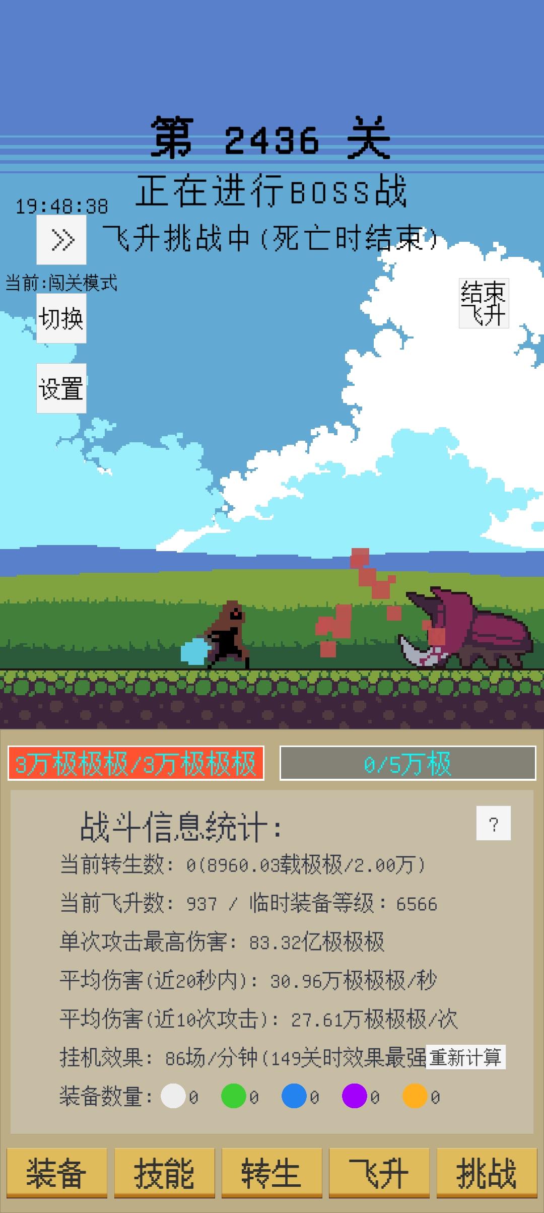 0转时,装备找暴击词条,暴击1000次解锁技能组成--防御力加成+首爆增伤+首伤必爆;然后装备换成找爆伤词条(装备基础数值不重要,熔炼给的三维才是大头),这样打小怪一刀杀,boss打不赢也没事三维提上去会过的。在线挂效率高,想离线的话就打到效果最强关再退。几个小时后就达到转生条件了(立刻转生溢出没好处)转生后升装备掉落加成解锁紫装。 1转时,前期技能兔子+首爆增伤+首伤必爆 快速过图,装备方面还