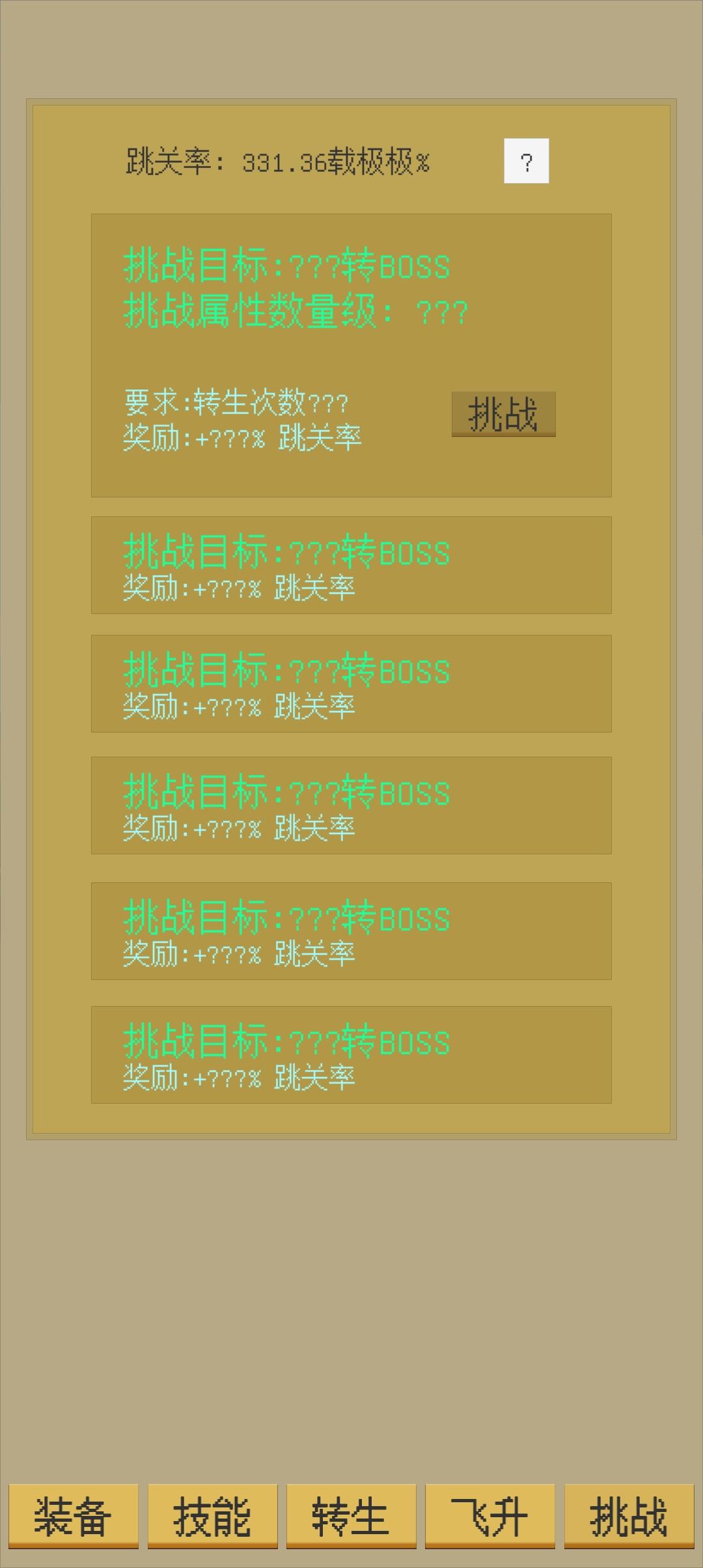 游戏玩法可以冷门,不要邪门。一转不算的情况下,保持在线,按照一关两秒的速度,每多一转多154个小关,200大关一共有2200个小关,用时4400秒,新进的可以看看,有命有闲可以进来玩。