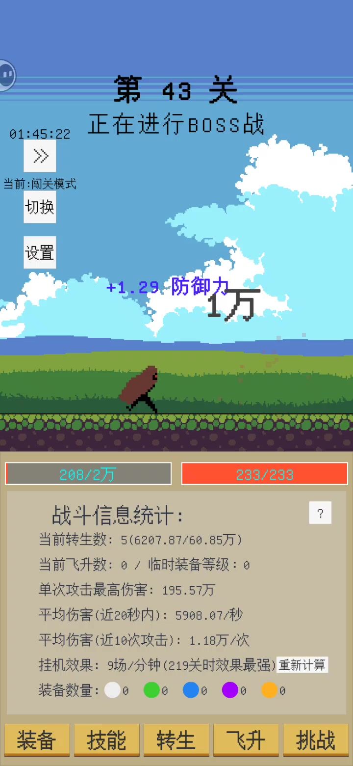 0转时,装备找暴击词条,暴击1000次解锁技能组成--防御力加成+首爆增伤+首伤必爆;然后装备换成找爆伤词条(装备基础数值不重要,熔炼给的三维才是大头),这样打小怪一刀杀,boss打不赢也没事三维提上去会过的。在线挂效率高,想离线的话就打到效果最强关再退。几个小时后就达到转生条件了(立刻转生溢出没好处)转生后升装备掉落加成解锁紫装。 1转时,前期技能兔子+首爆增伤+首伤必爆 快速过图,装备方面还