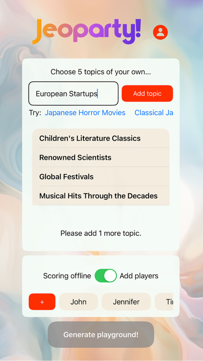 Jeoparty! is an interactive party game app that's inspired by the excitement of Jeopardy and designed for memorable gatherings. This isn't just any quiz game; it's a dynamic, AI-driven experience that tailors to your preferences, ensuring that every ...