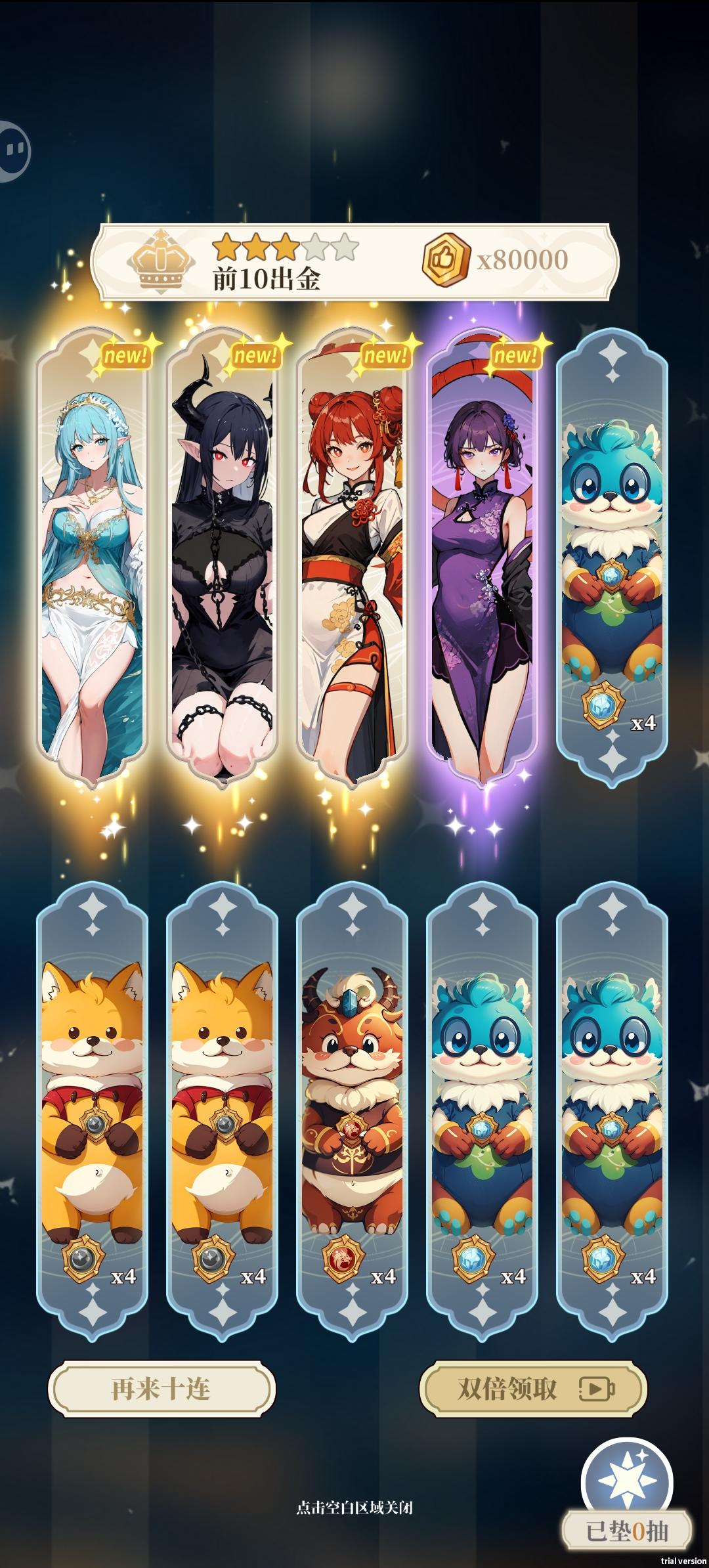 3游戏的玩法做一个总结就打通过抽卡来拿到游戏的无限货币,可以通过任务或者看广告挂机来获取游戏资源,适合上班摸鱼或者碎片时间进行游玩。