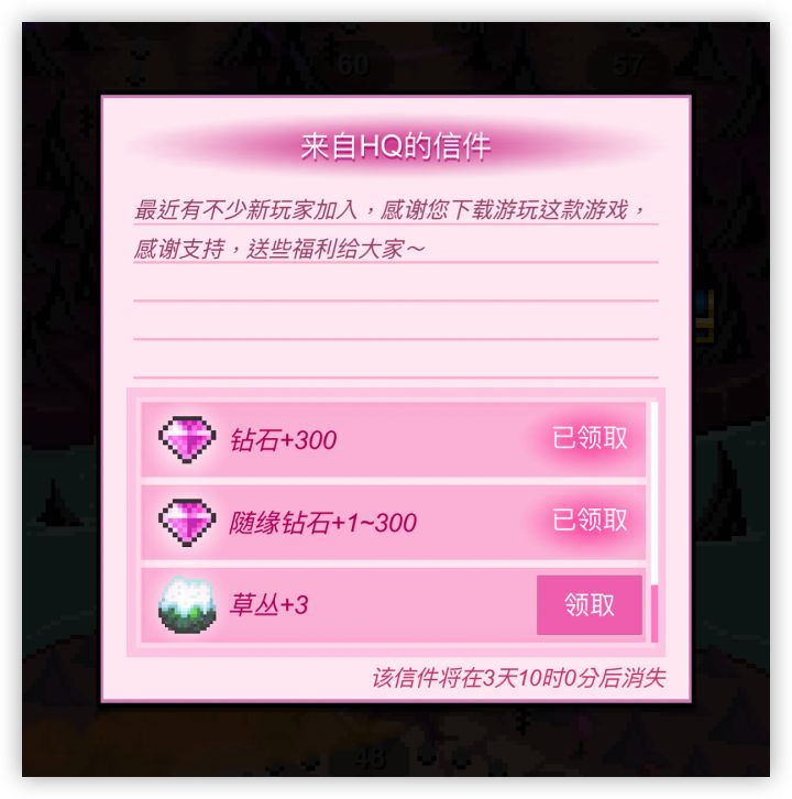 嗨~大家好,最近不少新人加入游戏,感谢大家的支持。打开游戏在关卡界面的右上角会有一封新邮件, 点开即可领取相关福利。钻石:300随机钻石:1~300同伴草丛:3随机属性进化石:3福利将在3天后过期,请及时领取哦~