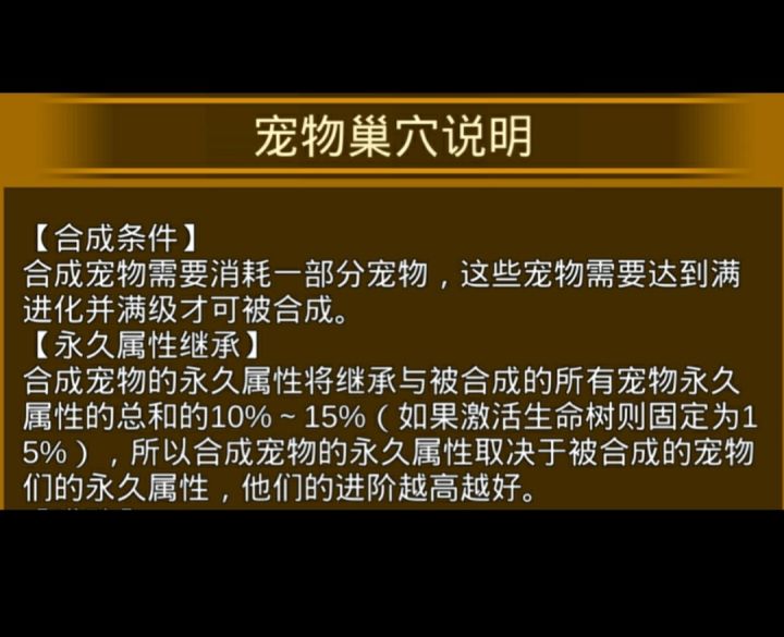 对宠物系统不了解的萌新可以先看一下宠物系统的介绍贴https://www.taptap.com/topic/6198884首先,合成宠物的血量和攻击由底材的继承属性决定,史诗宠物最终属性为继承属性×系数160 ,传说宠物最终属性为继承属性×系数250。所以继承属性直接决定了宠物的强弱。我们来看一下继承属性的说明继承属性为被合成宠物永久属性总和的10%-15%(黄金树玩家为固定值15%