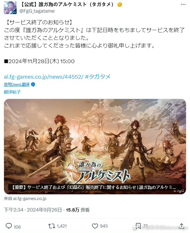 9/26号下午,《为谁而炼金》官方发文宣布,日服将在2024/11/28正式停服❗❗❗据悉,本游戏于2016年1月28日开始运营,运营至今已有8年多,也算是个“长命”的游戏了而且,《为谁而炼金》国服曾经在2017/10/19内测,现早已没了动静不知道大家怎么看?#今天游戏圈发生了啥 #游戏资讯 #资讯评论员 #为谁而炼