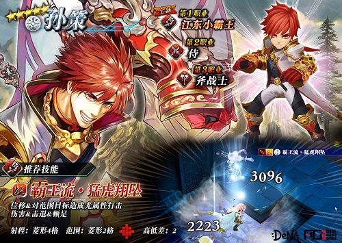 推荐搭配:推荐职业:江东小霸王推荐基本能力:基本霸王战技推荐反应能力:霸王流·金乌啼鸣推荐支援能力:持斧者的斗志或霸王浴血推荐支援能力:死中求生推荐理由光系优秀的坦克型英灵,同时还具备强大的控场能力队长技能50%20%的配比相当出色,提升百分之十的速度可以说相当不错。自身速度不慢,孙策自带大范围群嘲技,技能附带减速,减伤,弱甲等控制效果,作为坦克来说控场手段非常全面。而且开场的自