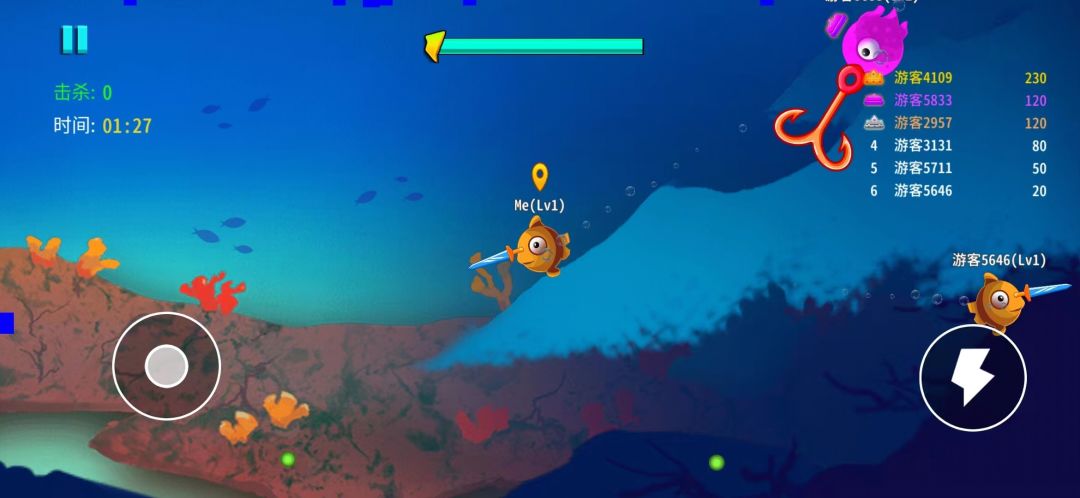 控制你的鱼,刺杀其他鱼,获得最后的胜利.